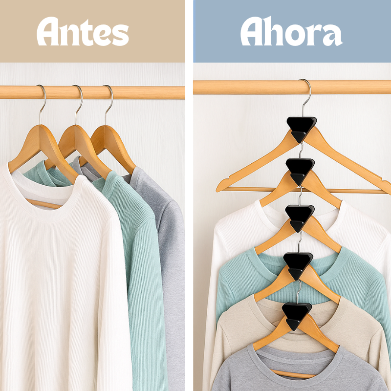¡Dile adiós al caos en tu armario! Con los ganchos RUBY™, podrás organizar tu ropa de forma vertical, creando hasta 70% más espacio en segundos. Funcionan con cualquier tipo de perchas y no necesitan herramientas. ¡Orden y comodidad al instante!